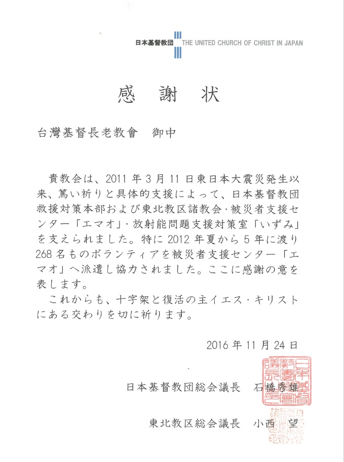 日本基督教團感謝台灣基督長老教會總會援助東日本大震災感謝狀